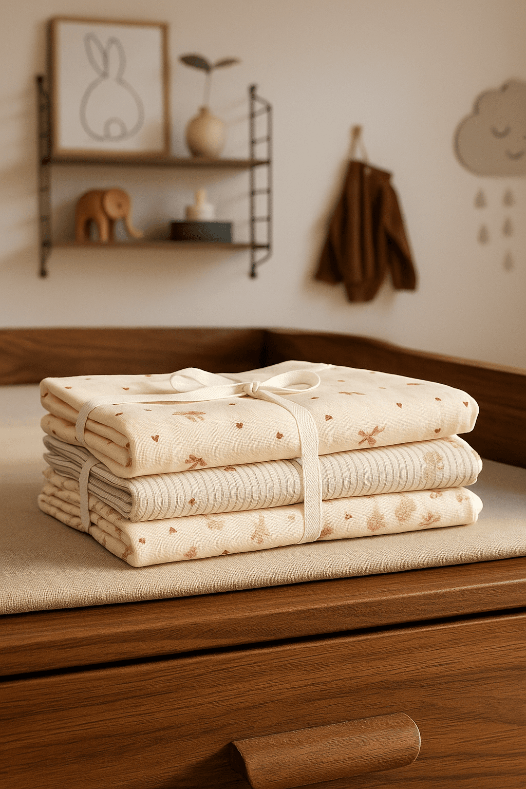 Wat ik mooi vind: de prints zijn subtiel, vaak geïnspireerd door natuurlijke motieven – bloemen, strepen, zachte kleuren zoals camel, crème en pastelgroen. De uitstraling is rustig en rustgevend – precies wat je wilt in de babykamer waar al zoveel visuele prikkels zijn.
