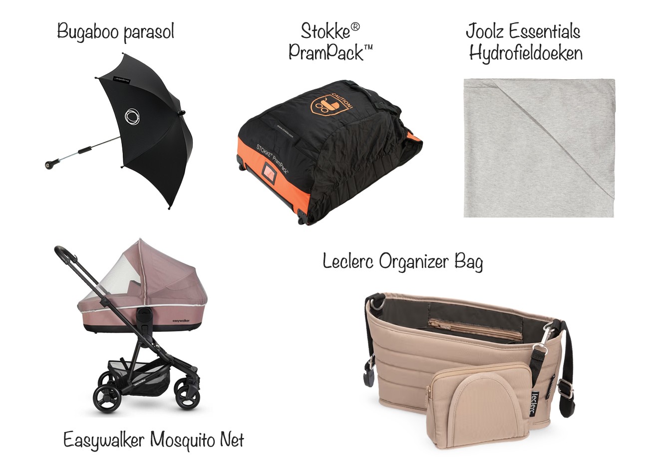kinderwagen accessoires 2025, trendy kinderwagen accessoires, luxe kinderwagen accessoires, must have kinderwagen accessoires, bugaboo parasol kopen, stokke prampack review, joolz hydrofieldoeken ervaringen, easywalker muggennet, organizer bag kinderwagen, moderne baby accessoires